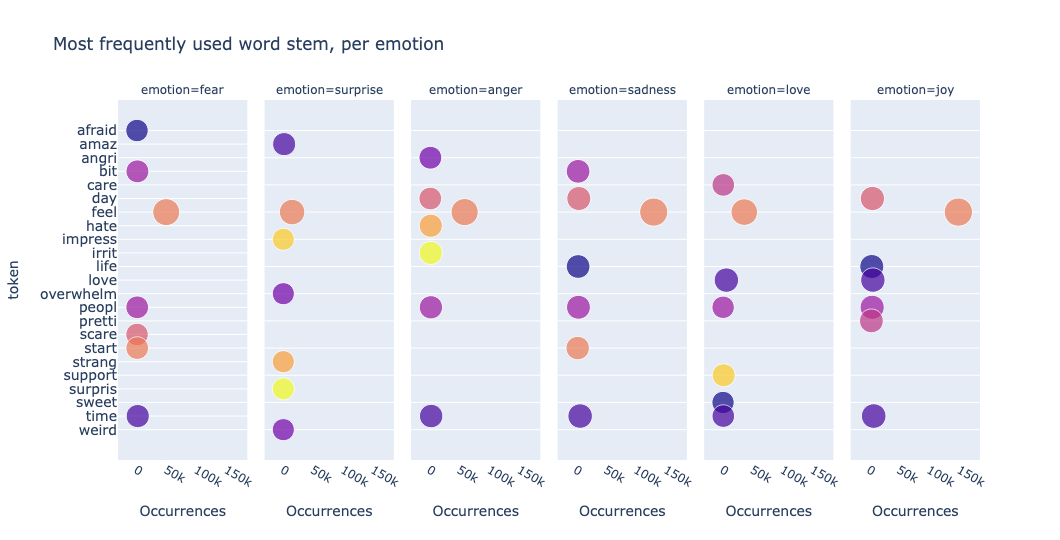 We can also visualize the data to gain insights. One simple and effective approach is to plot the most frequently used words. By counting token occurrences across the dataset and displaying them in bubble plots, we can quickly identify dominant themes, repeated keywords, or unusual patterns in the text. For example, we plot the data by using a scatter facet plot per emotion: